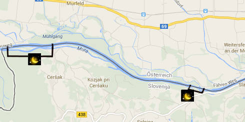 Von der Grenze sowohl überschreitend Sladki Vrh flussaufwärts bis zum Damm als auch in Ceršak von der Fabrik bis zum Damm. Im Kanal von dem kleinen Wasserkraftwerk Ceršak flussaufwärts bis zum Damm.