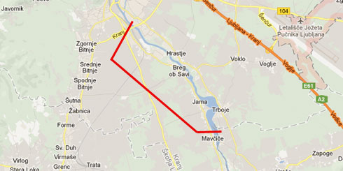 From the narrow bridge at the factory Planika to the barrier of the hydropower plant Mavčiče.